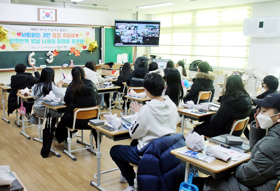 해마루초등학교(교장 이사열)는 지난 7일 제8회 졸업식을 개최했다. 코로나19로 교실에서 학생들만 참여한 가운데 방역지침을 지키며 아쉬운 작별의 행사를 진행한 것이다.