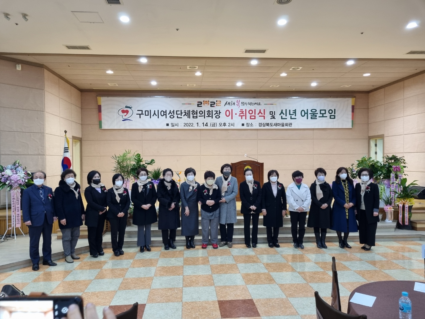 구미시여성단체협의회 회장 이ㆍ취임식 및 신년 어울모임이 지난 14일 경북도새마을회관 대강당에서 구자근 국회의원, 김창숙 명예회장(장세용 구미시장 사모), 이화자 초대회장, 박교상, 송용자, 권재욱, 김춘남, 장세구, 장미경 구미시의원, 김락상 경북중부신문 대표이사 및 회원 등이 참석한 가운데 개최되었다.