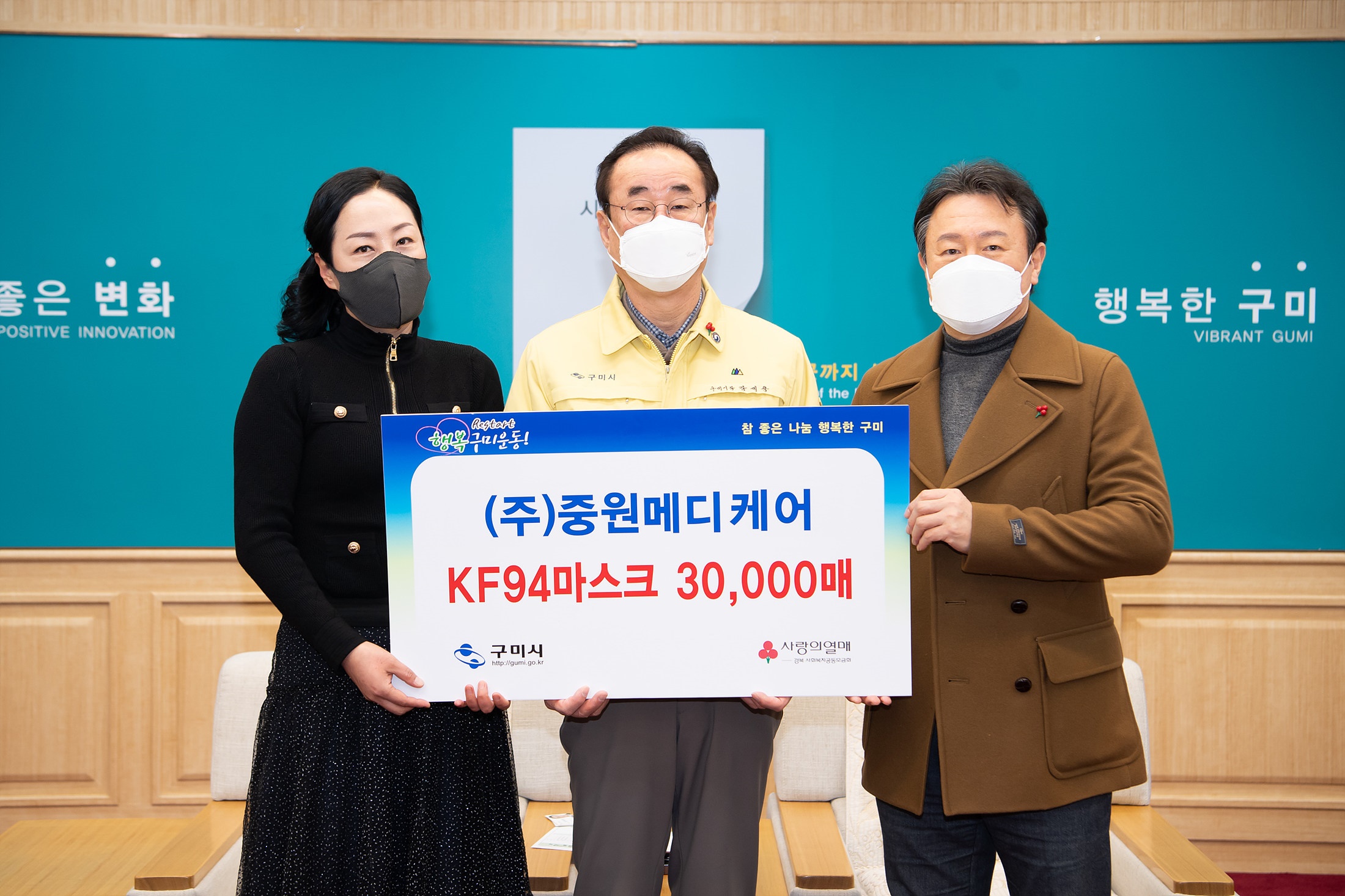 관내 마스크 유통업체인 ㈜중원메디케어(대표 안승표)가 지난 9일 코로나19 극복을 위한 KF94 마스크 3만매(1,200만원 상당)를 구미시에 기탁했다.