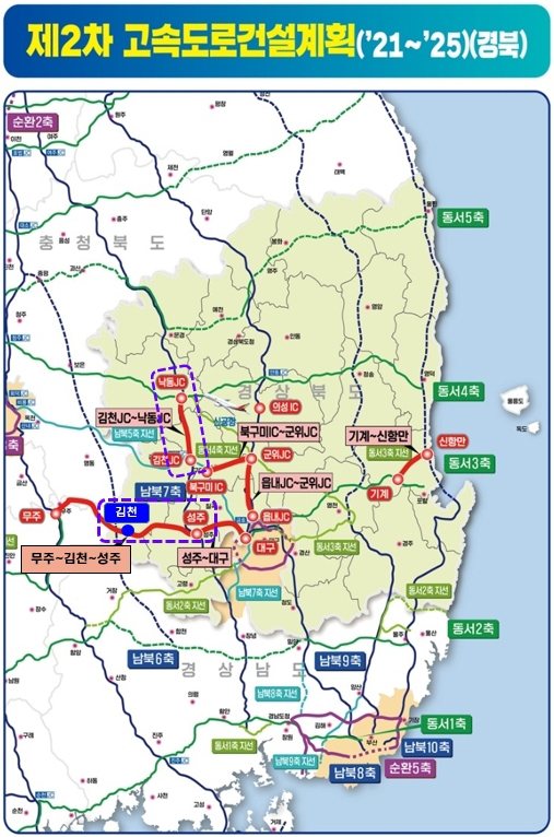 이번 노선에는 김천시가 지속적으로 건의해온 “무주∼김천∼성주” 연결 고속도로가 반영되어 향후 예비타당서 조사를 거쳐 사업을 시행하게 되었다.