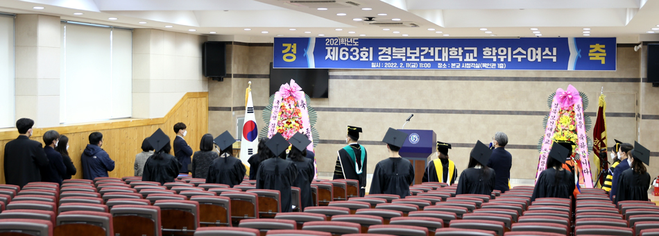 경북보건대학교(총장 이은직)는 지난 11일 교내 목인관 시청각실에서 이은직 총장 및 대학 관계자와 졸업생 수상자 8명이 참석한 가운데 제63회 학위수여식을 비대면으로 개최했다. 코로나 상황을 고려하여 비대면 학위수여식은 동영상으로 제작되어 경북보건대학교 공식 유튜브에 게재되어 학생들에게 공개할 예정이다.