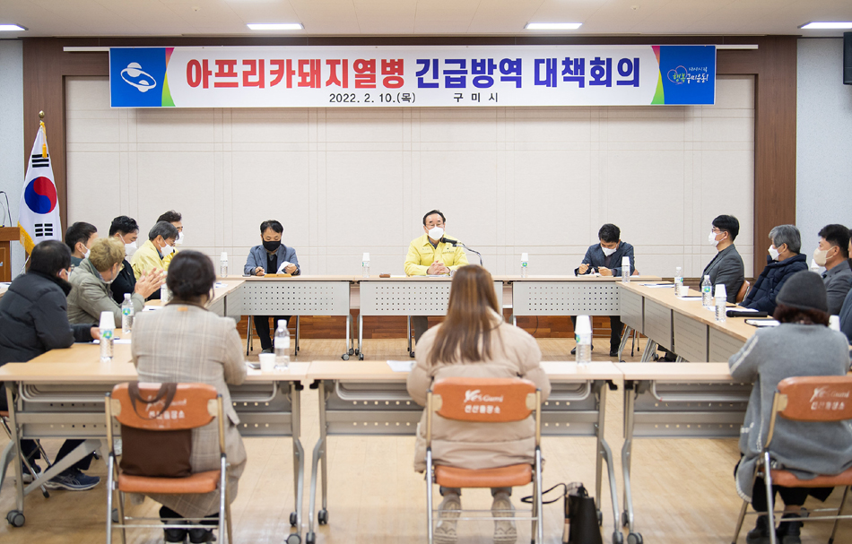이날 대책회의는 지난 1월 28일 충북 보은군 장안면에 이어 2월 8일 구미와 30km 떨어진 상주시 화남면 평온리에서 야생멧돼지에 아프리카돼지열병이 연달아 발생함에 따라 위기상황을 공유하고, 지역 내 유입을 막기 위해 개최됐다.