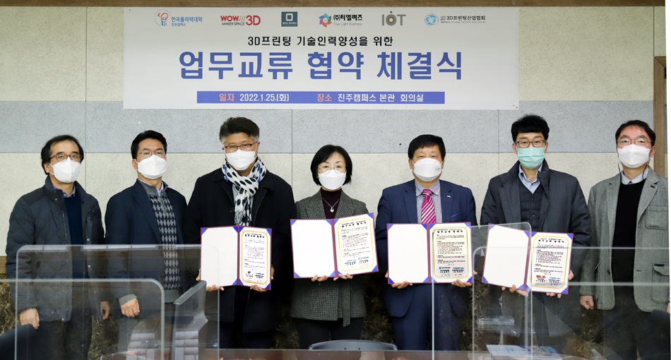 이번 협약은 한국폴리텍대학 진주캠퍼스, 사단법인 3D프린팅산업협회, 아이오티, ㈜와우쓰리디, 웰웍스, ㈜티엘비즈 간 3D프린팅 산업 발전을 위해 상호협력을 통한 지역맞춤형 신기술 인재 양성 및 일자리 창출에 기여하는 목적으로 체결되었다.