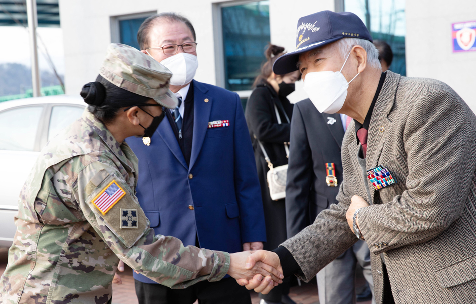 이날 애구언 로메인 엠 대대장은 참전용사와 양손을 맞잡으며 감사 인사를 전하고 건강관리에 각별히 유의할 것을 당부했다.