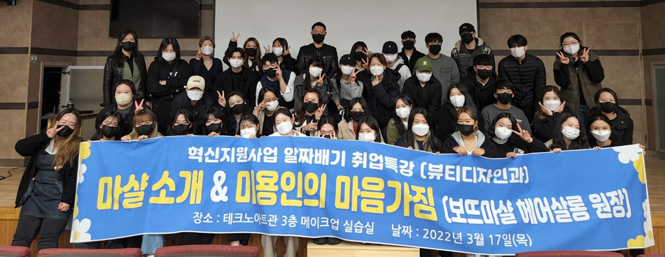 이번 ‘알짜배기 취업특강’프로그램에는 보뜨마샬 헤어살롱 한사무엘 원장이 강사로 참여를 하였고, 재학생의 실무역량 강화 및 현장실무교육 강화를 목적으로 프랜차이즈 매장운영과 특징에 대한 이해 및 미용인의 자세와 마음가짐에 대한 내적 역량 강화를 통해 취업 준비 역량 향상을 위해 지난 3월 17일 목인관 시청각실에서 진행되었다.