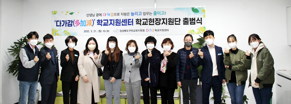 구미교육지원청(교육장 이성희)은 지난 21일 학교지원센터사무실에서 학교지원센터장을 비롯한 담당장학사, 학교지원센터 직원이 참석한 가운데‘다가감 학교현장지원단’의 첫 발걸음을 힘차게 내딛었다.
