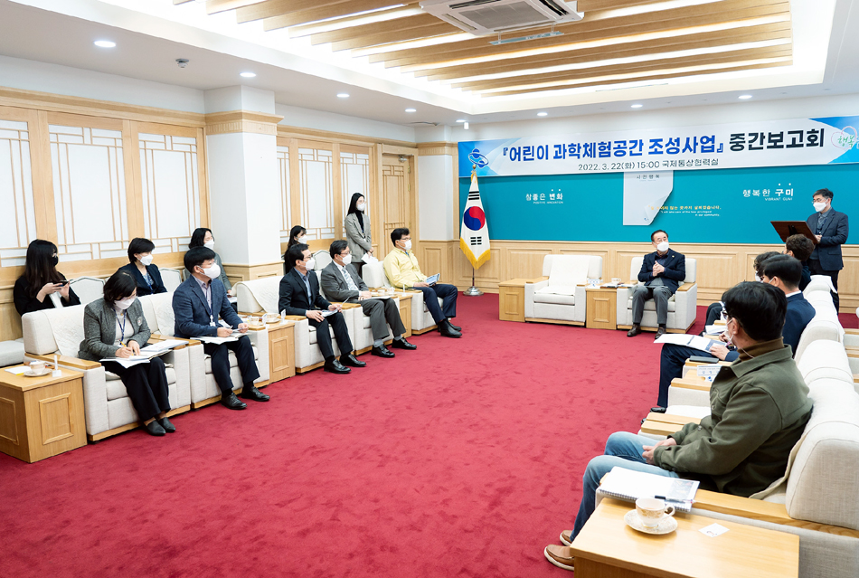 구미시는 지난 22일 시청 국제통상협력실에서 시의원 및 관계자 등 10여명이 참석한 가운데 ‘어린이 과학체험공간 조성사업’ 중간보고회를 개최했다.