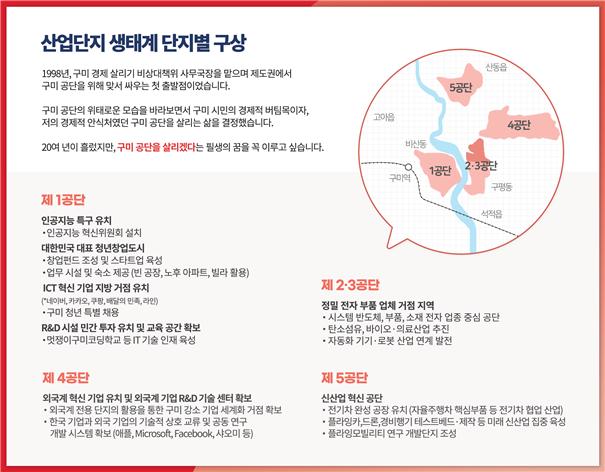 김 예비후보 구상에 따르면 ▲1공단 : 인공지능 특구 및 청년창업 공단, ▲ 2 ,3공단 : 정밀 전자 부품 공단, ▲ 4공단 : 외국계 혁신 기업 유치 및 외국계 기업 R&D 기술 센터 확보, ▲ 5공단 : 신산업 혁신공단 및 전기차 완성 공장 유치 등을 발표했다.