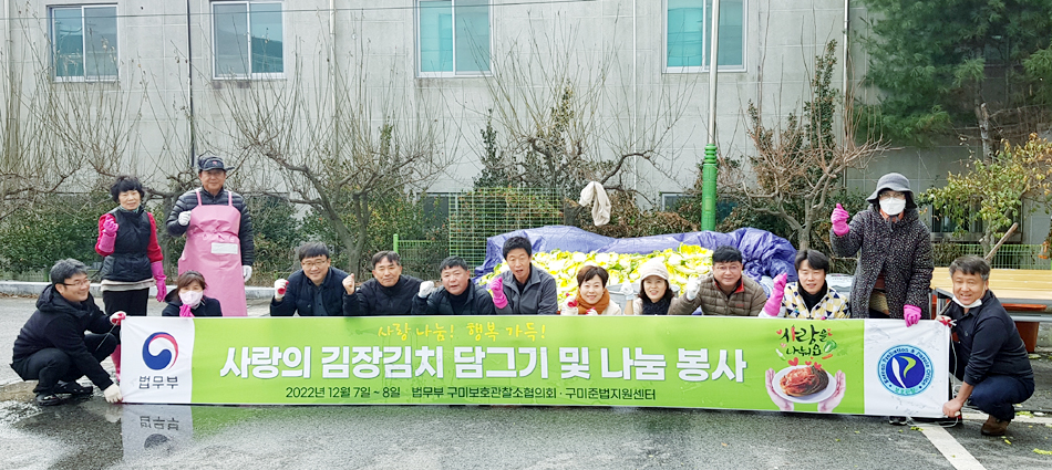 보호관찰위원 구미보호관찰소협의회(최재석 회장)는 법무부 구미준법지원센터(이재화 소장)와 공동으로 직접 재배한 배추를 활용하여 ‘사랑의 김장김치 나눔 행사’행사를 가졌다.