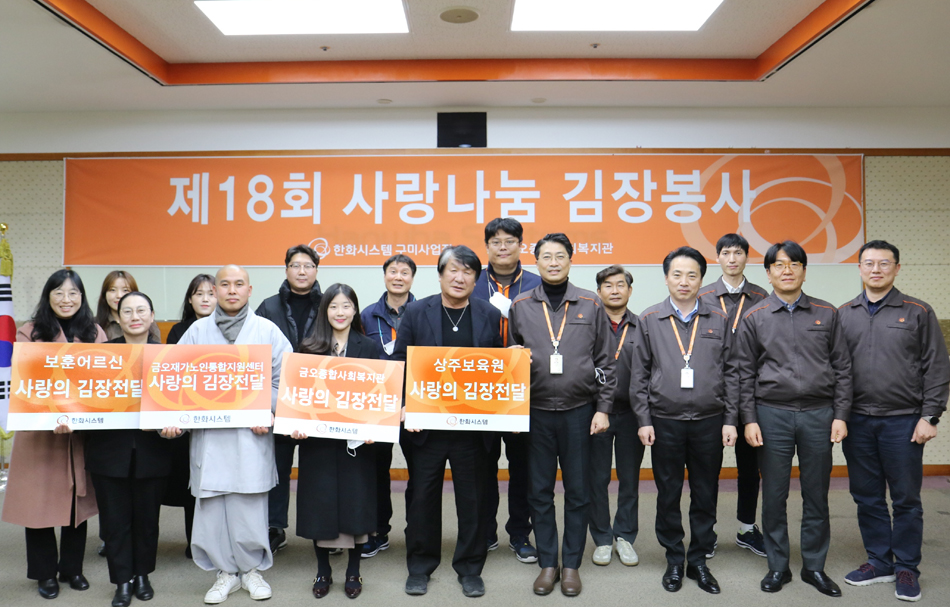 지난 2004년부터 시작되어 올해로 18회를 맞은 ‘사랑나눔 김장봉사’는 한화시스템 구미사업장 임직원이 직접 김치를 담그고 포장하여 지역사회에 나누는 한화시스템 구미사업장의 대표적인 사회공헌 활동이다.