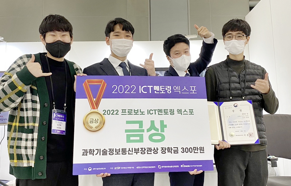 국립금오공과대학교(총장 곽호상) 학생들이 ‘2022 프로보노 ICT 멘토링 공모전’에서 금상에 해당하는 ‘과학기술정보통신부장관상’을 수상했다.