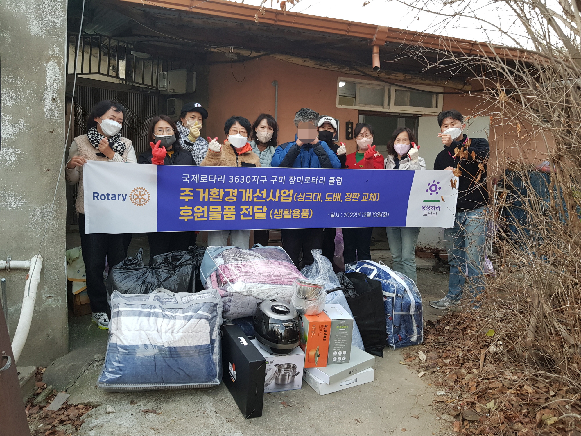 총공사비 432만원 지원과 200만원 상당의 후원물품을 전달하고 국제로타리클럽 3630지구 구미장미로타리클럽 10명의 회원들이 함께 집안 곳곳 대청소를 지원했다.