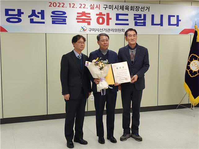 윤상훈 구미시체육회장 당선자가 지난 22일 구미시선거관리위원회(위원장 이윤호)로부터 당선증을 교부받았다.