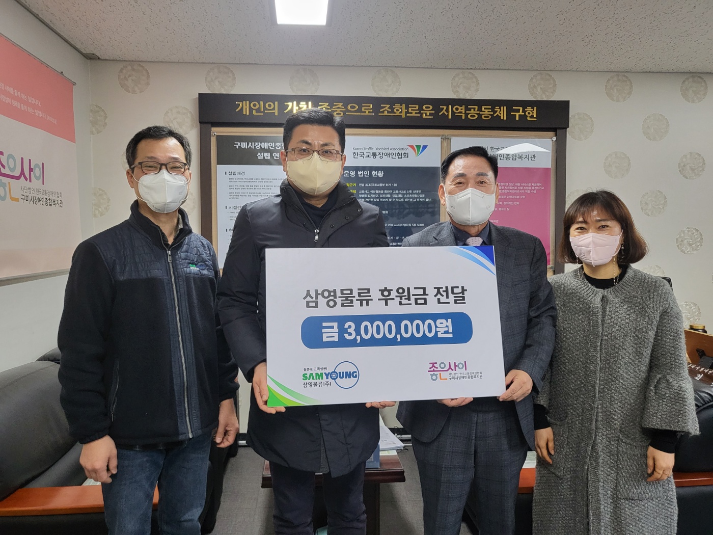 삼영물류(주)(대표이사 이상근)는 지난 22일 연말연시를 맞아 구미시장애인종합복지관(관장 김휴진)에 소외된 이웃을 돕기 위한 성금 300만원을 전달했다.