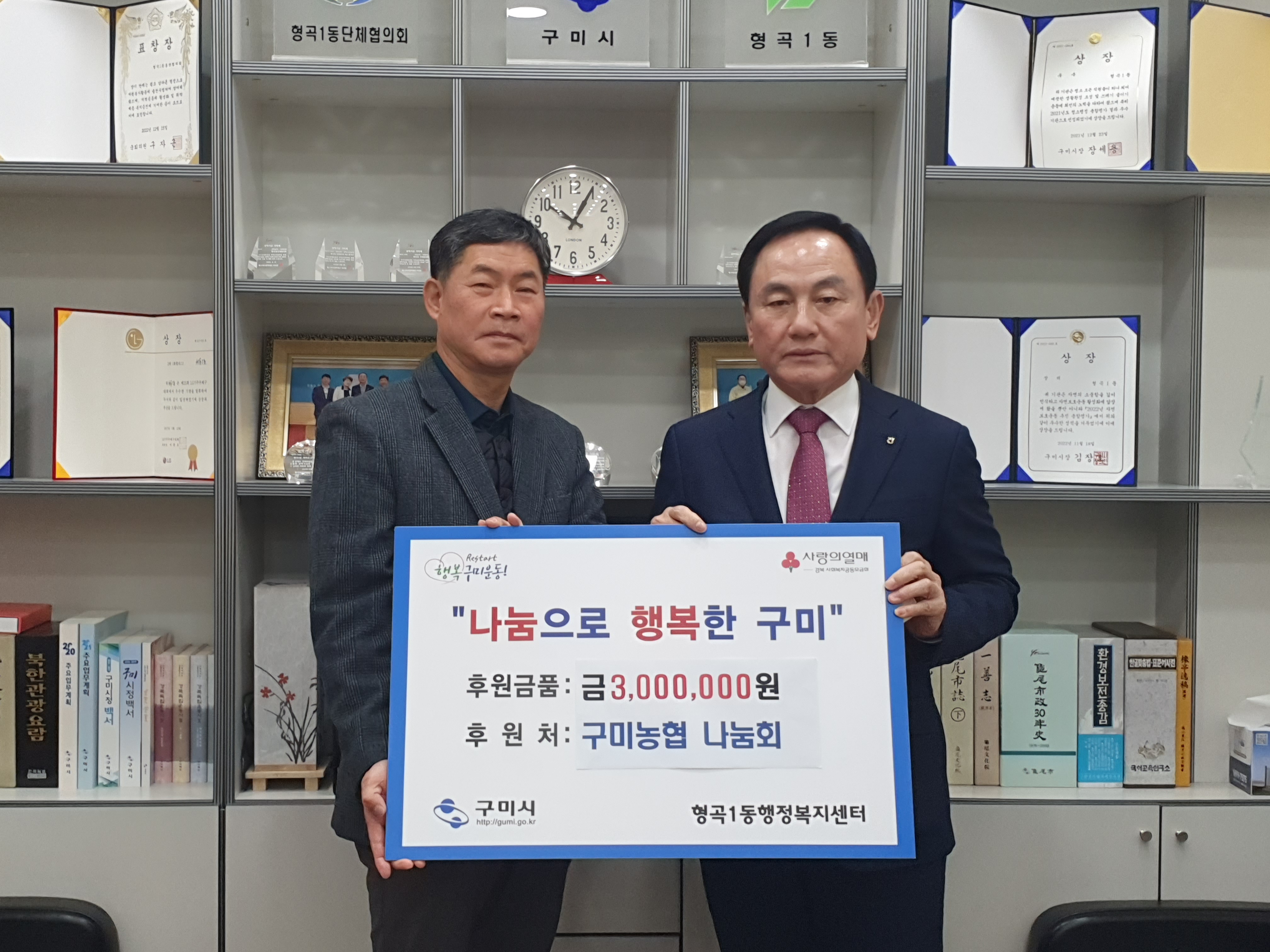 형곡1동(동장 최성국)에서는 지난 26일 구미농협 나눔회(조합장 김영태, 회장 조성주)에서 이웃돕기 성금 300만원을 기탁했다.