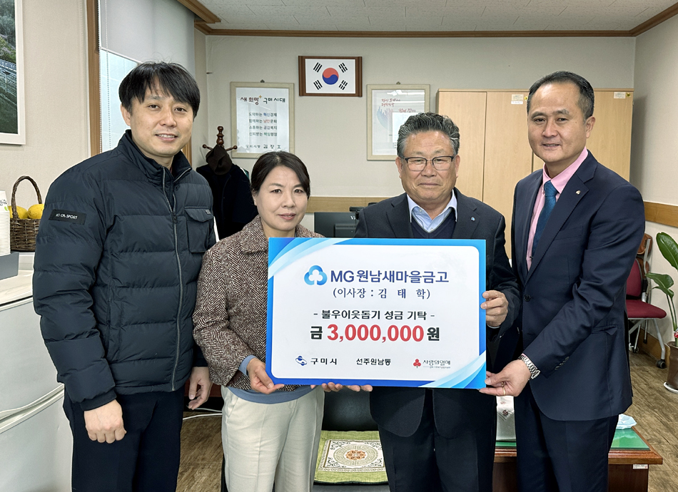 선주원남동(동장 박향목)에서는 지난달 30일 원남새마을금고 (이사장 김태학)으로부터 이웃돕기성금 300만을 기탁받아 어려운 이웃에게 나눔으로 희망을 이어갔다.