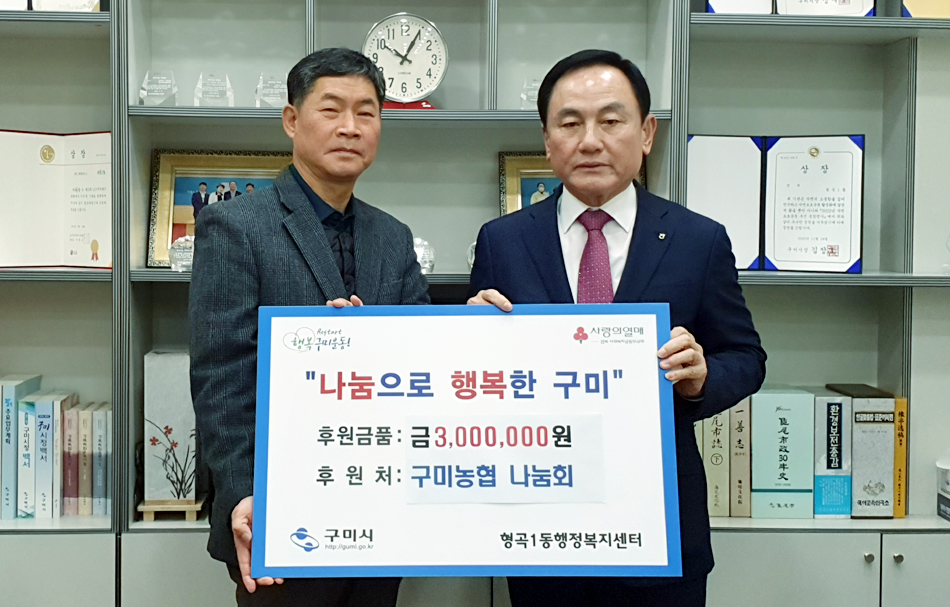 형곡1동(동장 최성국)에서는 지난달 26일 구미농협 나눔회(조합장 김영태, 회장 조성주)에서 이웃돕기 성금 300만원을 기탁했다.