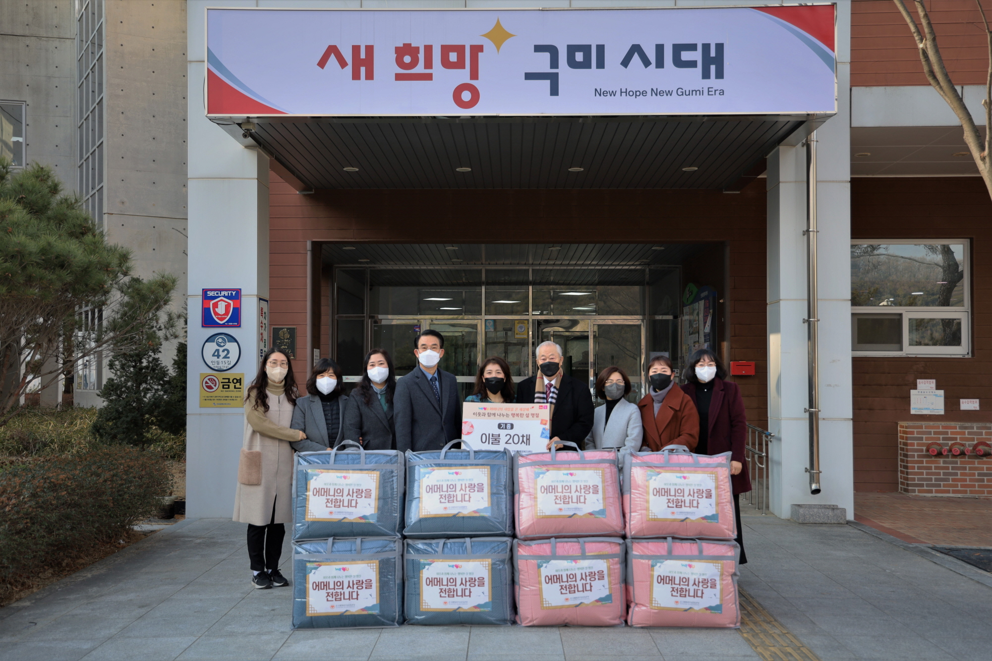 지난 16일 위러브유 회원들은 인동동행정복지센터를 찾아 이불 20채를 기탁했다. 이들을 맞이한 권미영 동장은 “외롭고 어려운 분들을 위해 설을 맞아 따뜻한 마음을 담아서 봉사해 주신 국제위러브유운동본부 회원분들게 감사드리며 주변의 어려운 이웃들에게 그 마음을 담아서 잘 전달하겠다.”고 말했다.