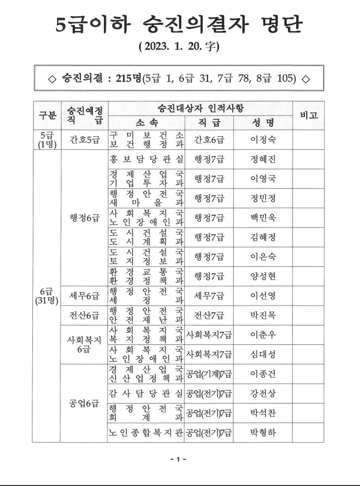 구미시 5급이하 승진의결자 명단(23.01.20)