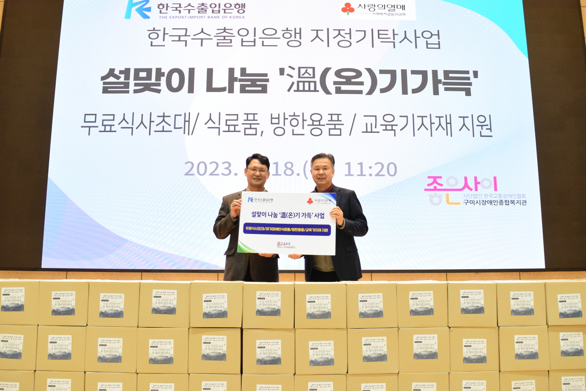 설맞이 ‘溫(온)기가득’ 후원전달식은 ▲무료식사 초대(삼계탕, 400명), ▲방한용품 지원(550명), ▲저소득 재가장애인 식료품 지원(150가정), ▲시설 교육기자재 지원 등으로 진행됐다. 이는 한국수출입은행의 2천만원 지정기탁으로 이루어졌으며 후원금 사용의 적절성과 투명성 제고를 위해 사회복지공동모금회를 통해 전해졌다.