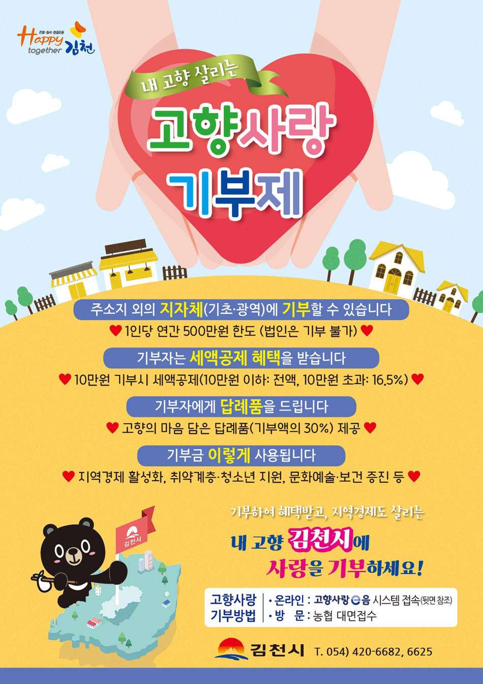 김천시(시장 김충섭)는 고향사랑기부제의 성공적인 안착을 위해 지난해 총력을 다해왔으며 제도 시행 첫날부터 재경김천향우회 김현태 회장의 기부의사 표명 소식과 함께 기부자들의 기부행렬이 이어지며 순조로운 출발을 했다.