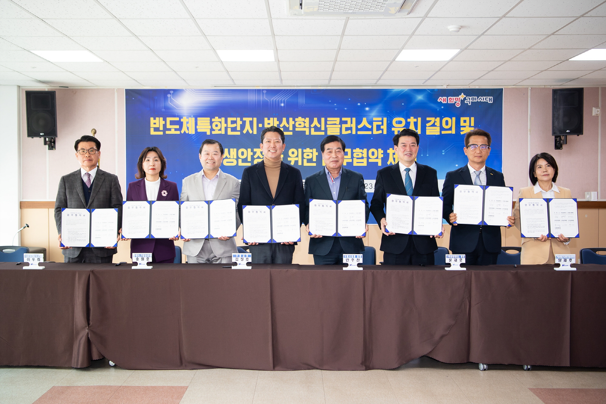 구미시는 9일 종합비즈니스지원센터에서 지역 경제6단체와 함께 첨단반도체 소재부품 특화단지 및 방산혁신 클러스터 유치를 위한 결의와 민생안정을 위한 업무협약 행사를 개최했다.