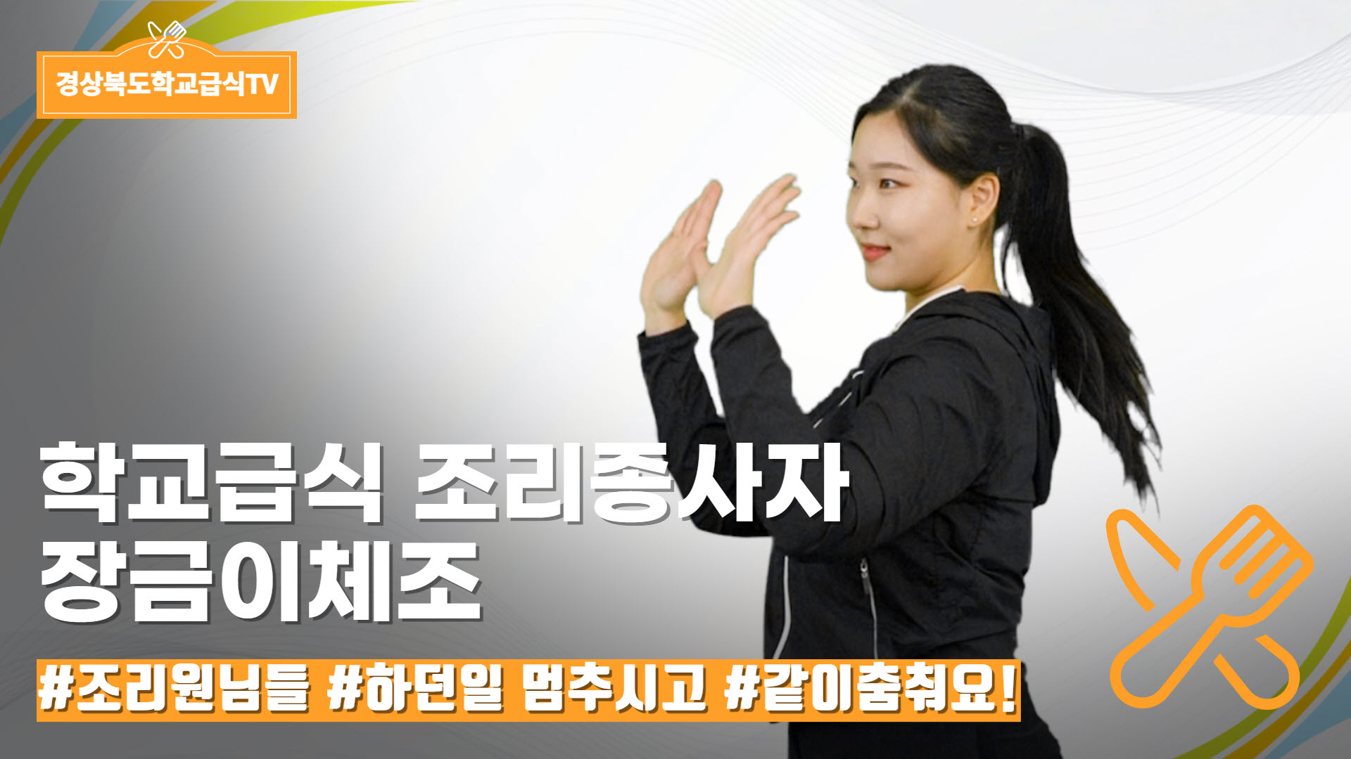 ‘조리종사자용 장금이체조영상’은 안전사고 예방을 위해 조리작업 전 몸을 풀기 위한 동작으로 구성했으며, 신나는 트로트 음악인 ‘파트너’를 배경음악으로 제작했으며 중등 체육교사연구회(상주여자중 김태희 교사)의 협조로 만들어졌다.