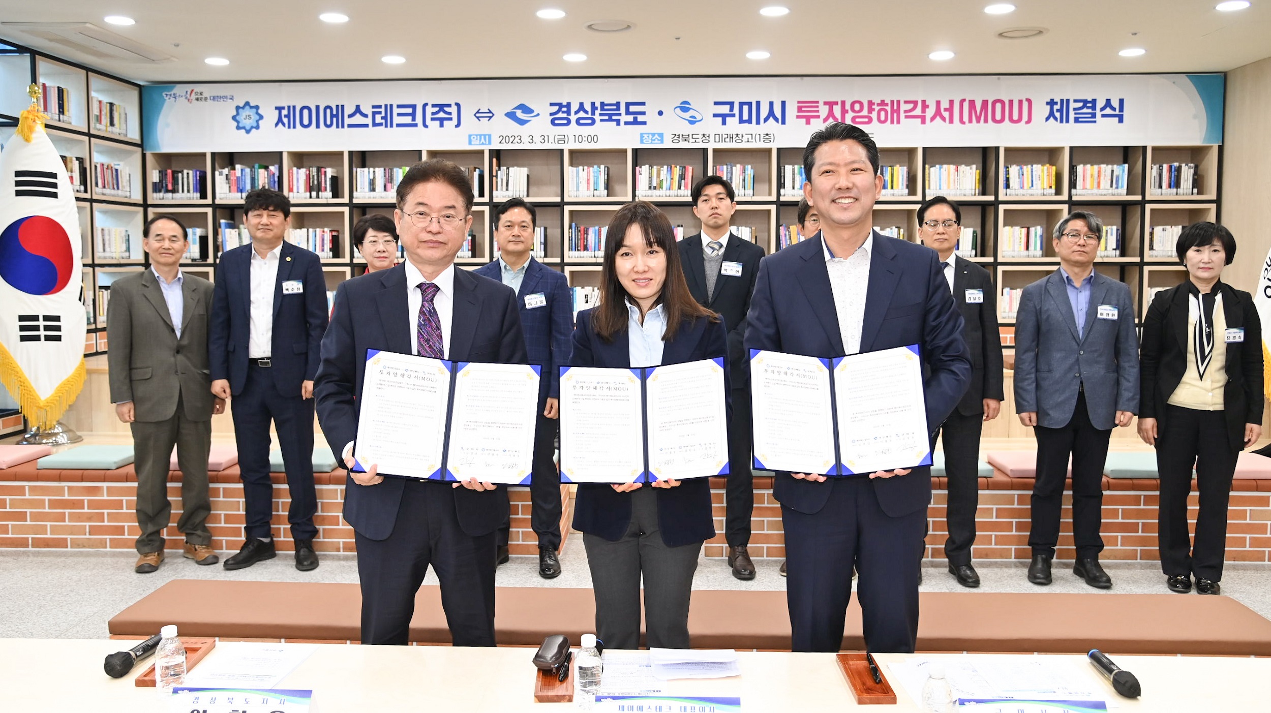 구미시는 31일 경북도청 미래창고에서 이철우 경북도지사, 김장호 구미시장, 제이에스테크(주) 김민강 대표, 백순창 경북도의원을 비롯한 관계자 20여 명이 참석한 가운데 제이에스테크(주)의 구미하이테크밸리 투자와 관련 양해각서(MOU)를 체결했다.