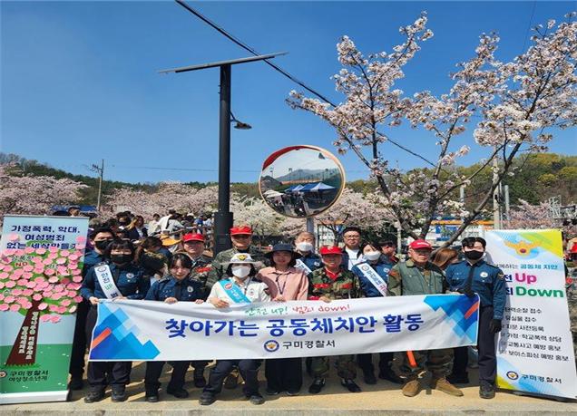 구미경찰서(서장 장종건)에서는 최근 열린 금오천 벚꽃축제, 고아웃 캠핑장 행사장에서 경찰, 지자체, 협력단체 회원 등 30여명이 참여한 가운데 ‘찾아가는 공동체치안 활동’을 운영했다.