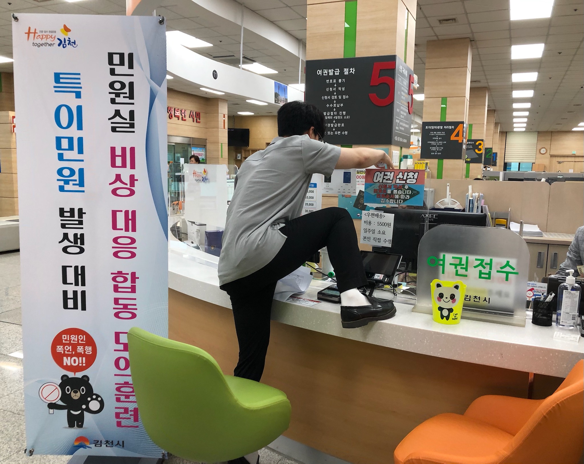 김천경찰서와 합동으로 진행된 이번 훈련은 ▲민원인 폭언 발생과 상급자 적극 개입 진정 유도, ▲사전 고지 후 웨어러블 캠을 활용한 촬영, ▲긴급 상황 발생 시 민원실에 설치된 비상벨 위치 및 정상 작동 여부 확인, ▲피해 공무원 보호와 방문 민원인 대피, ▲민원인 제압 및 출동 경찰 인계 등으로 진행됐다.
