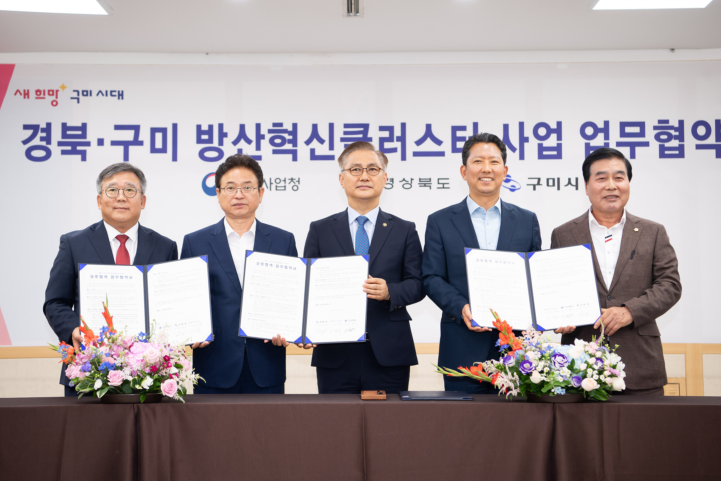 경북도는 2일 구미시청에서 지난 4월 공모 선정된 ‘경북ㆍ구미 방산혁신클러스터사업’의 성공적인 추진을 위해 이철우 경북도지사, 엄동환 방위사업청장, 김장호 구미시장, 안주찬 구미시의회 의장 등이 참석한 가운데 방산혁신클러스터 성공추진 업무협약을 체결했다.