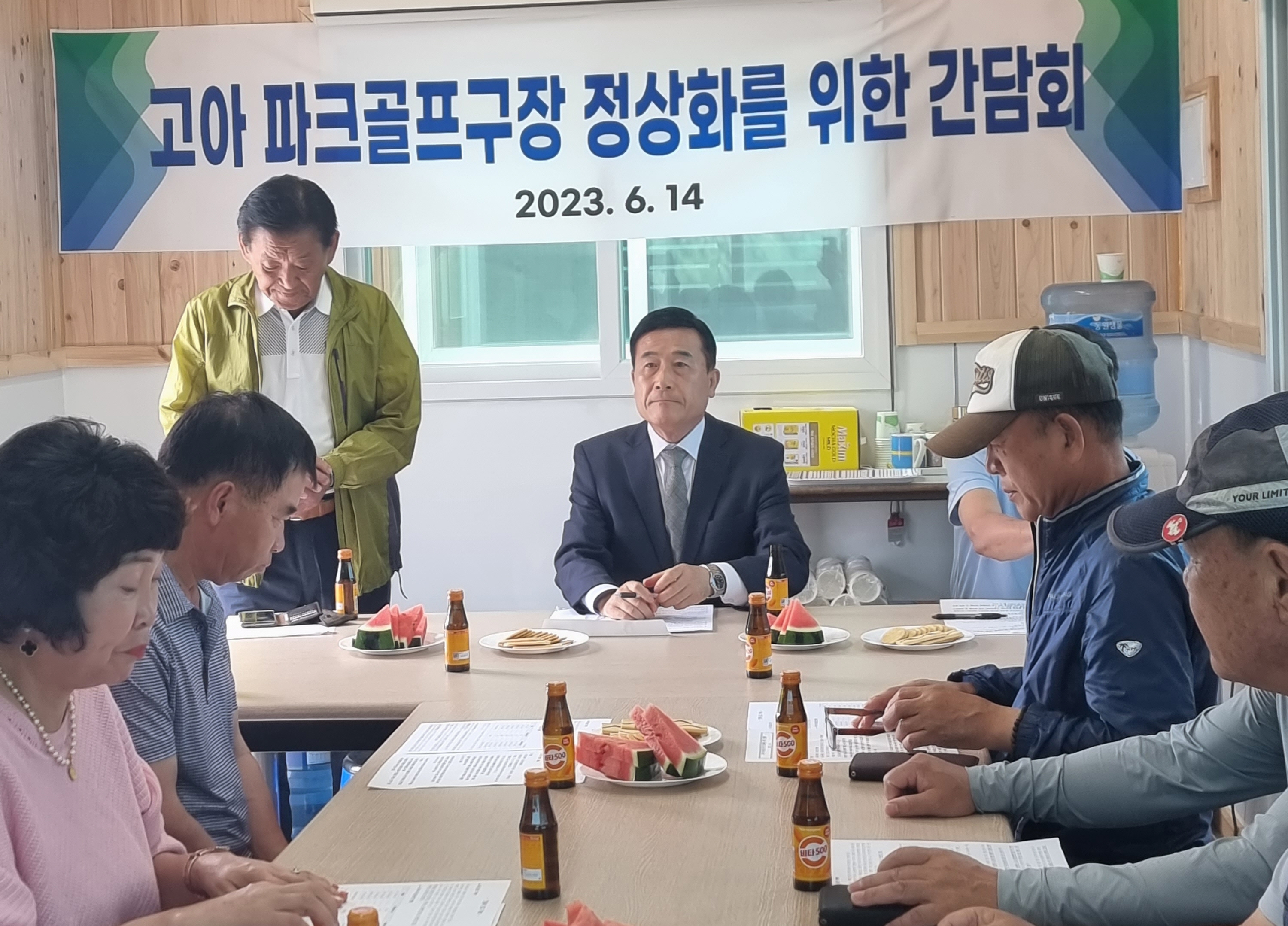 허성우 전 대통령실 국민제안비서관이 파크골프장 운영을 둘러싼 갈등을 해소하기 위해 고아지역민을 상대로 간담회에 참석했다.