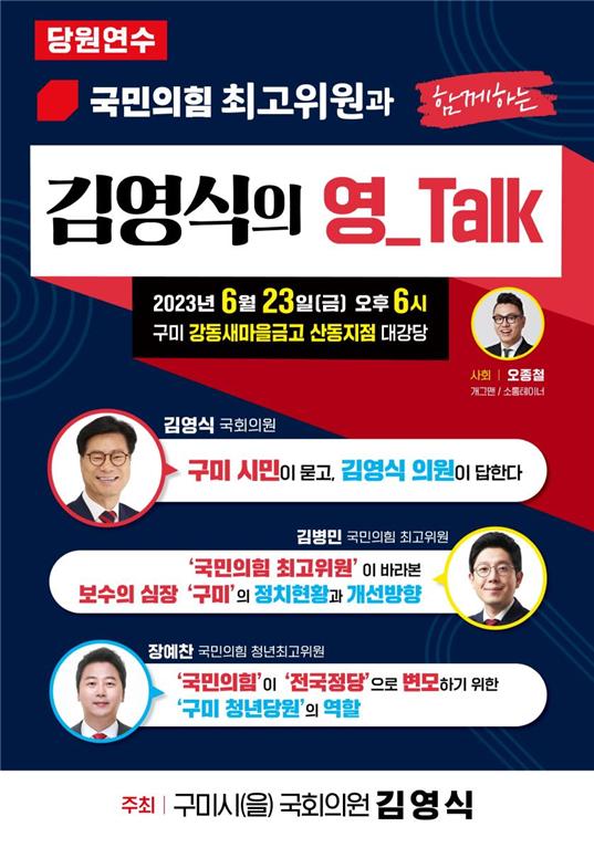 김영식 국회의원은 오는 23일 오후 6시 구미 강동새마을금고 산동지점 대강당에서 ‘국민의힘 최고위원과 함께하는 김영식의 영_Talk’이라는 주제로 당원연수를 개최한다.