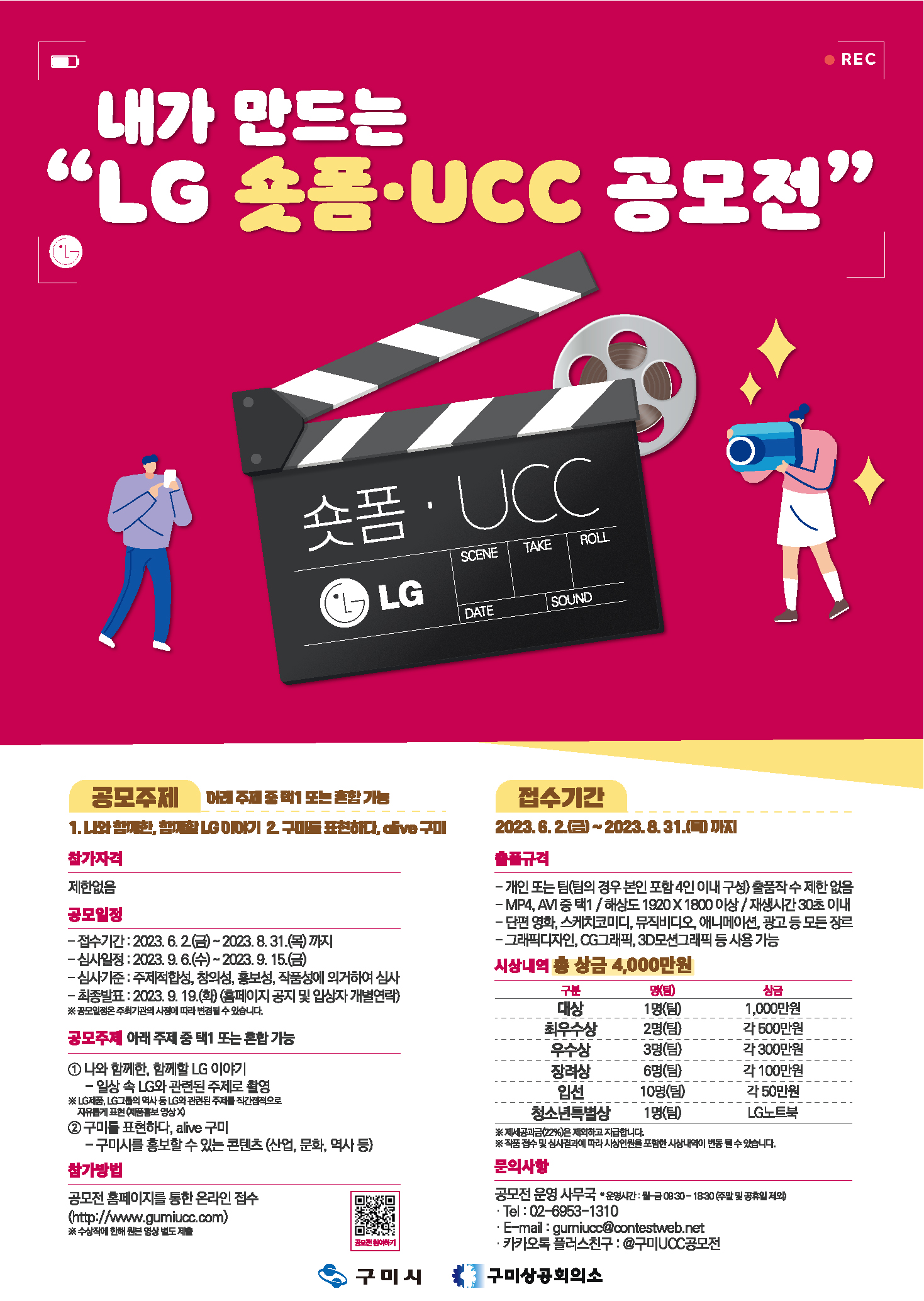 이번 공모전은 일상 속 LG와 관련된 주제로 촬영 및 편집해 ‘나와 함께한, 함께할 LG이야기’와 구미시를 홍보할 수 있는 산업, 문학, 역사 등의 콘텐츠를 활용한 ‘구미를 표현하다, alive 구미’ 등 두 가지 공모 주제 중 하나를 선택 또는 혼합해 지원 가능하다.