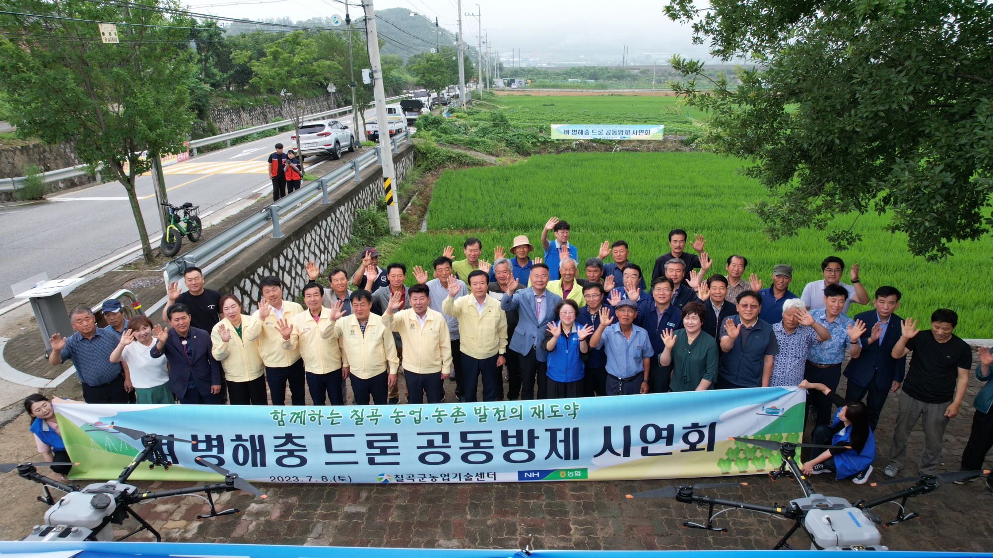 칠곡군농업기술센터는 지난 8일 북삼읍 숭오리 일원에서 김재욱 군수를 비롯해 도의원, 군의원, 농협관계자, 쌀전업농 등 100여명이 참석한 가운데 벼 병해충 드론 공동방제 시연회를 개최했다.