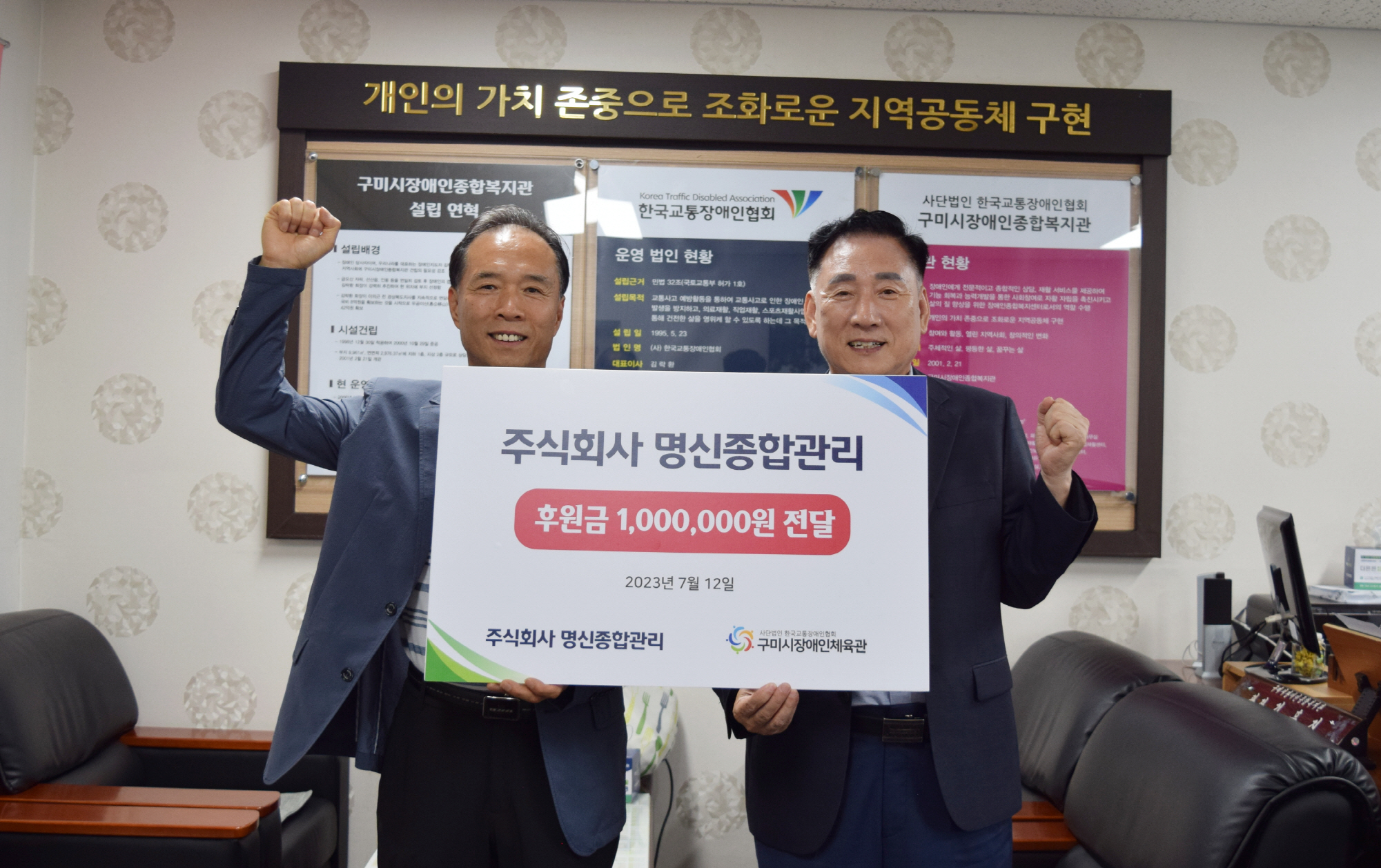 시설 및 건물 위생관리업체인 명신종합관리(대표 박성식)가 12일 지역장애인체육의 발전을 위해 구미시장애인체육관(관장 김휴진)에 100만원을 후원했다.