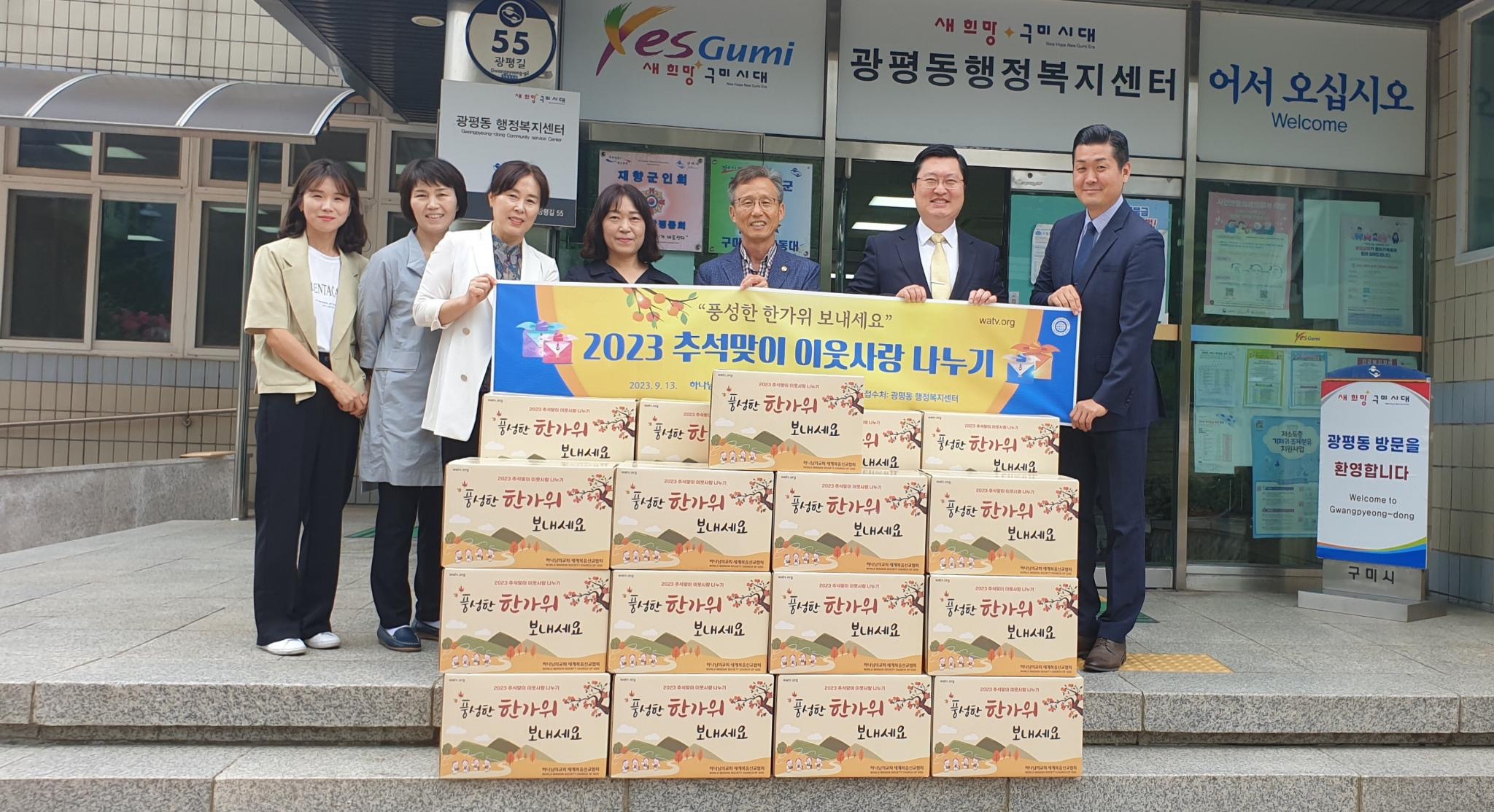지역사회 발전과 화합을 위한 공익 활동을 꾸준히 펼쳐온 하나님의교회 세계복음선교협회(총회장 김주철 목사, 이하 하나님의 교회)가 추석 명절을 앞둔 지난 13일 구미에서 이웃사랑을 전했다. 광평동 행정복지센터를 방문해 식료품 선물세트 25상자를 기탁했다.