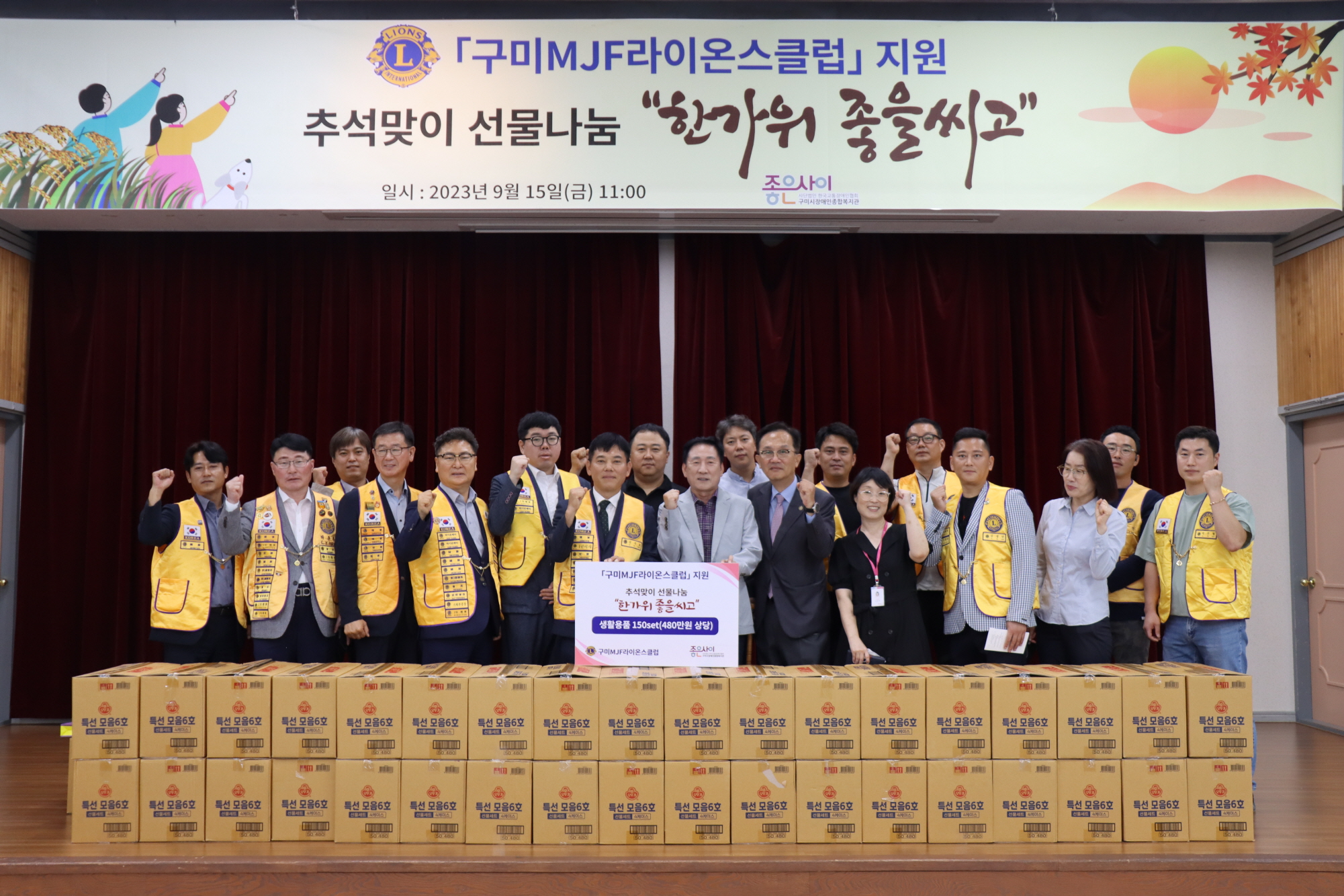 구미MJF라이온스클럽 신기호 회장은 “추석 명절을 맞아 어려운 이웃이 조금이나마 따뜻한 마음을 느낄 수 있도록 준비했으며 곧 다가올 가을과 겨울에는 구미시장애인종합복지관과 함께 장애인 취약계층에 주거환경개선과 난방비 지원을 진행할 계획”이라고 밝혔다.