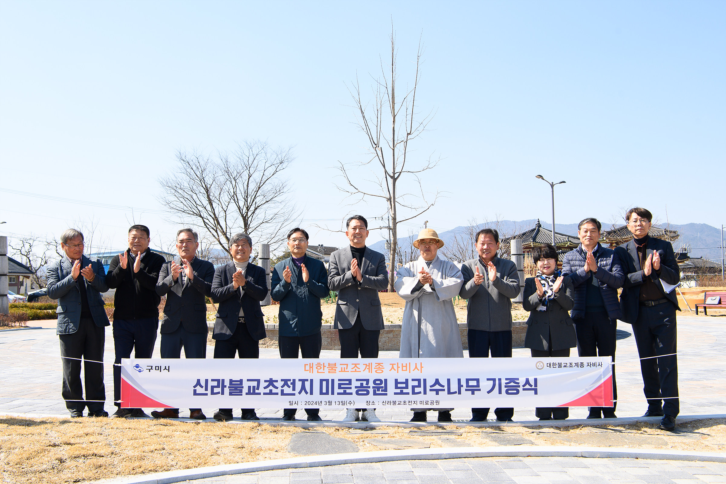 구미시는 13일 신라불교초전지 인근 미로공원에서 김장호 구미시장, 자비사 정신 스님, 양진오, 장미경 시의원, 이재웅 구미도시공사 사장, 주민 등 10여 명이 참석한 가운데 보리수나무(6주) 기증식을 열었다.