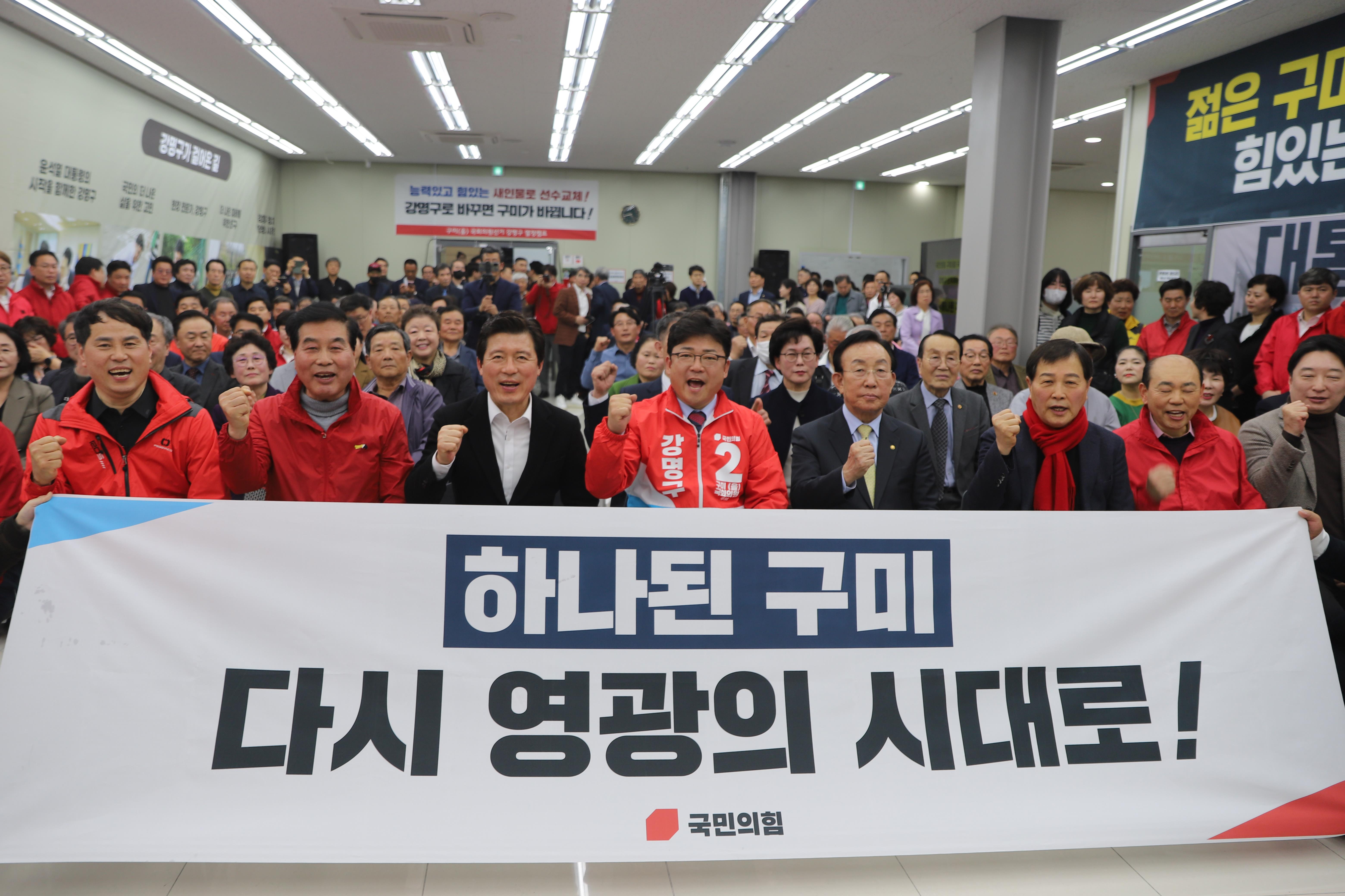 이날 개소식에서 강명구 후보는 “국민의힘의 승리를 위해 다가올 본선에서 구자근 구미(갑) 국회의원, 김봉교 전 경북도의회 부의장을 비롯한 구미시·도 의원과 함께 원팀으로 뜻을 모았고 구미 발전을 위해 이 자리에 함께해주신 시민 여러분들께도 감사드리며, 반드시 승리로 보답하겠다.”고 결의를 다졌다.