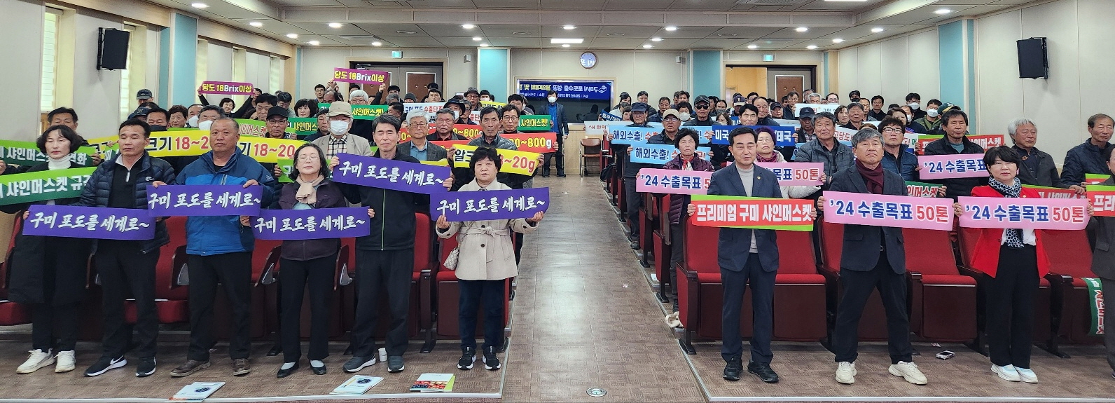 구미시 포도수출단지는 올해 해외수출 50톤을 목표로, 송이무게 500~800g, 당도 18brix 이상, 알크기 18g의 아삭하고 머스켓향이 나는 최고의 맛과 품질의 포도생산을 준비 중이며, 수출단지 농업인 대표(죽장농원 전성희)가 6가지 실천과제가 담긴 결의문을 낭독하고 참석자들과 결의를 다졌다.