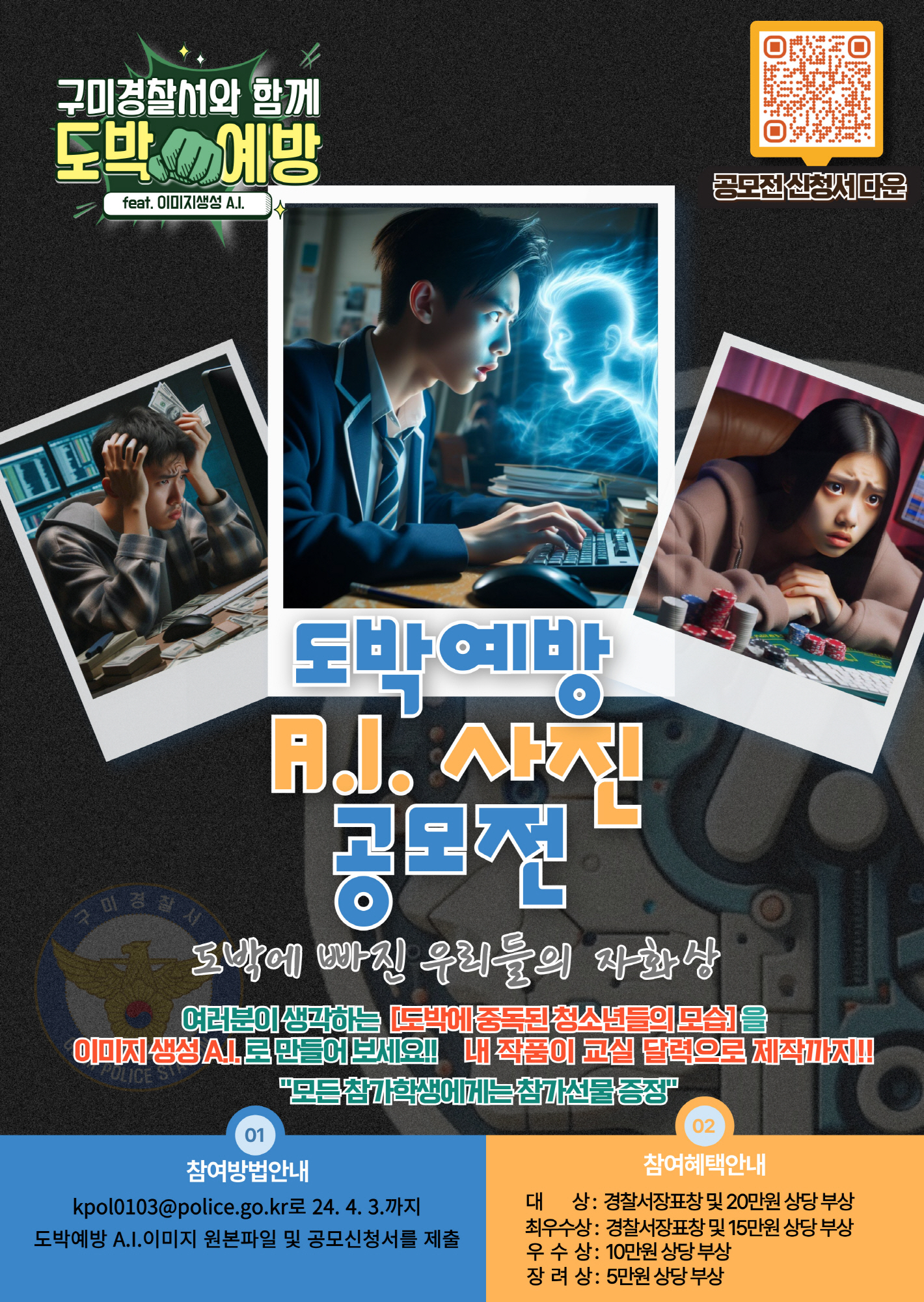 구미경찰서(서장 박종섭)는 관내 중·고등학교 재학생 및 학교밖 청소년들을 대상으로 4월 3일까지 ‘도박에 빠진 우리들의 자화상’이라는 주제로 이미지 생성 A.I.를 활용하여 사진 공모전을 개최한다.