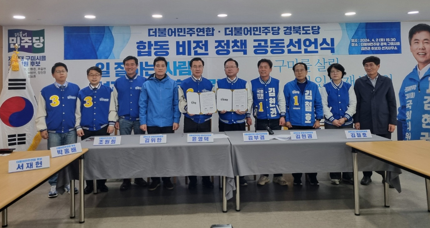 더불어민주연합과 더불어민주당 경북도당은 2일 ‘합동 ‘1석 3조’ 비전정책 공동선언식’을 갖고 이번 총선에서 윤석열 정권 심판과 민생, 민주, 미래 살리기를 위해 협력하기로 했다.