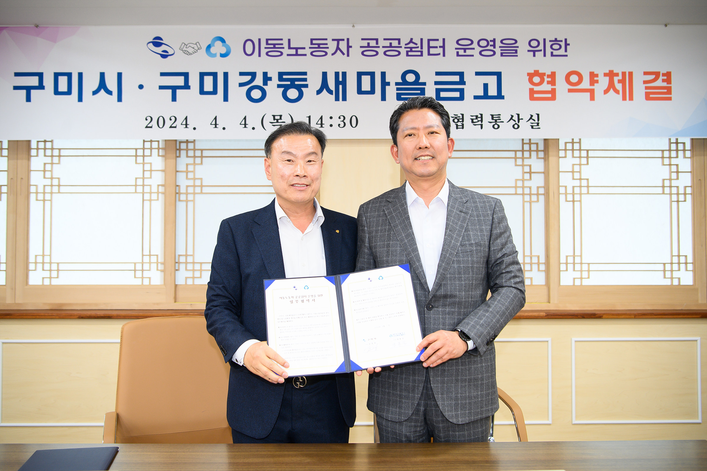 구미시는 4일 시청에서 구미강동새마을금고(이사장 장종길)와 이동 노동자들의 접근성과 편의성을 높이고, 편안한 휴식 공간을 제공하기 위해‘休마루’이동 노동자 공공 쉼터 운영을 위한 업무협약(MOU)을 체결했다.