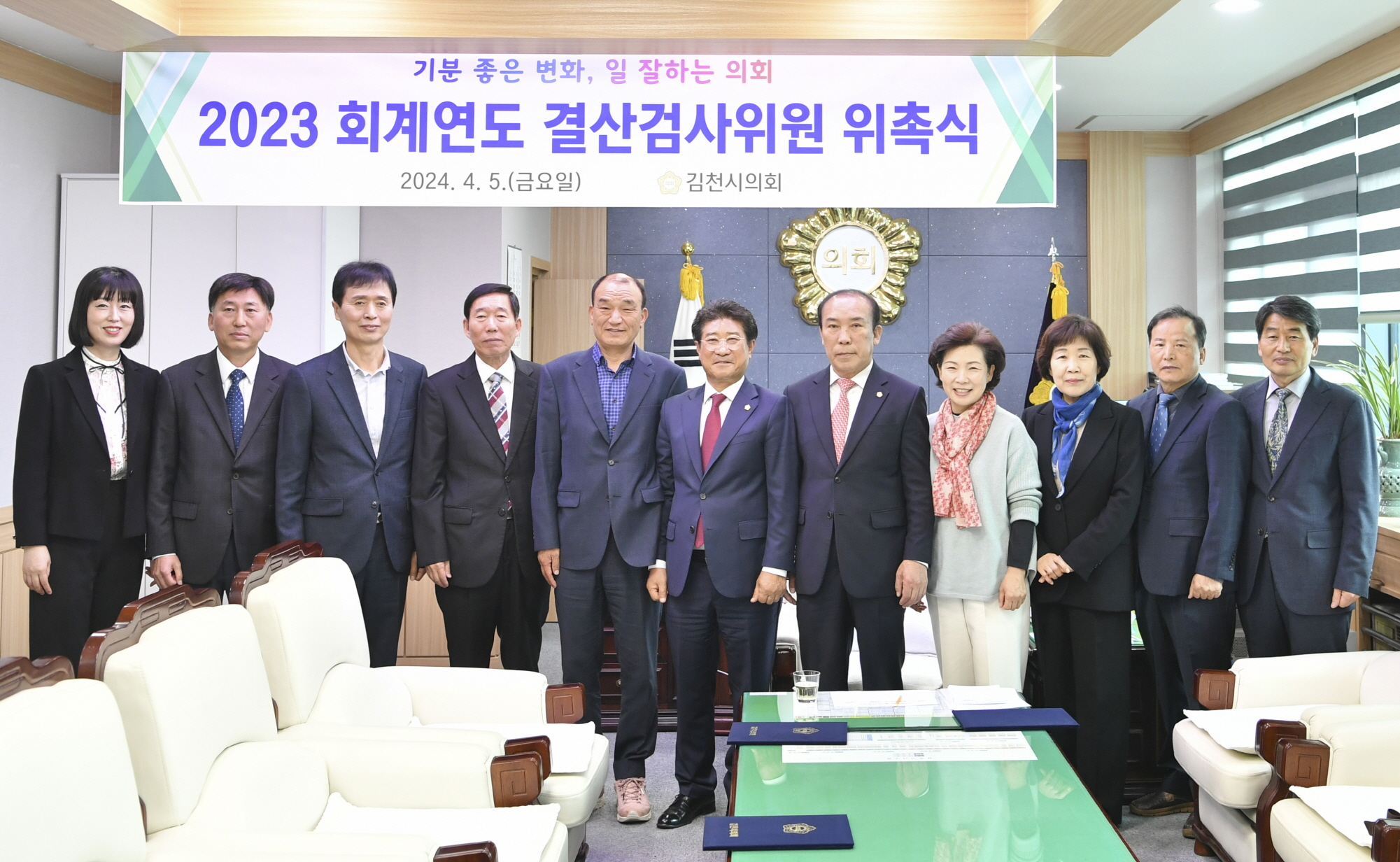 김천시의회(의장 이명기)는 5일 의장실에서 제242회 임시회에서 선임된 2023회계연도 결산검사위원의 위촉장 수여식을 가졌다.