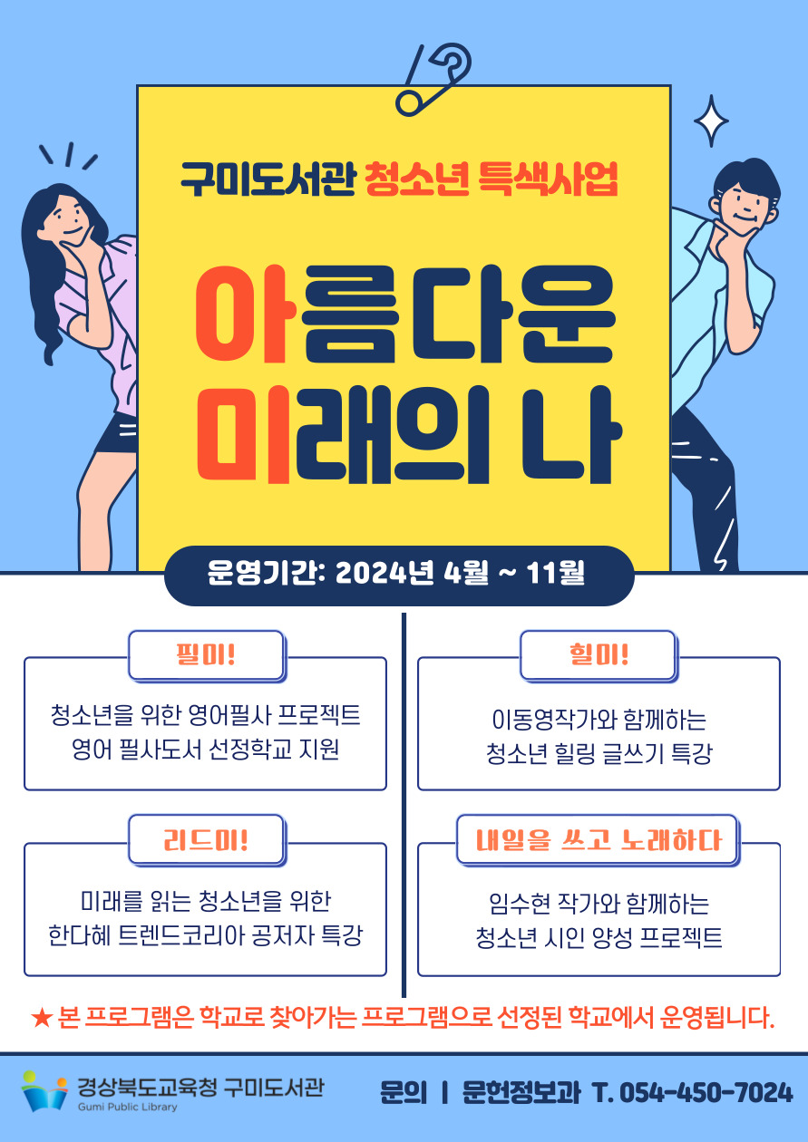 ‘아름다운 미래의 나’는 청소년들의 독서습관 형성과 도서관 이용을 활성화하기 위하여 구미도서관에서 기획한 중장기 특화 프로그램으로 청소년을 위한 특색사업이다.