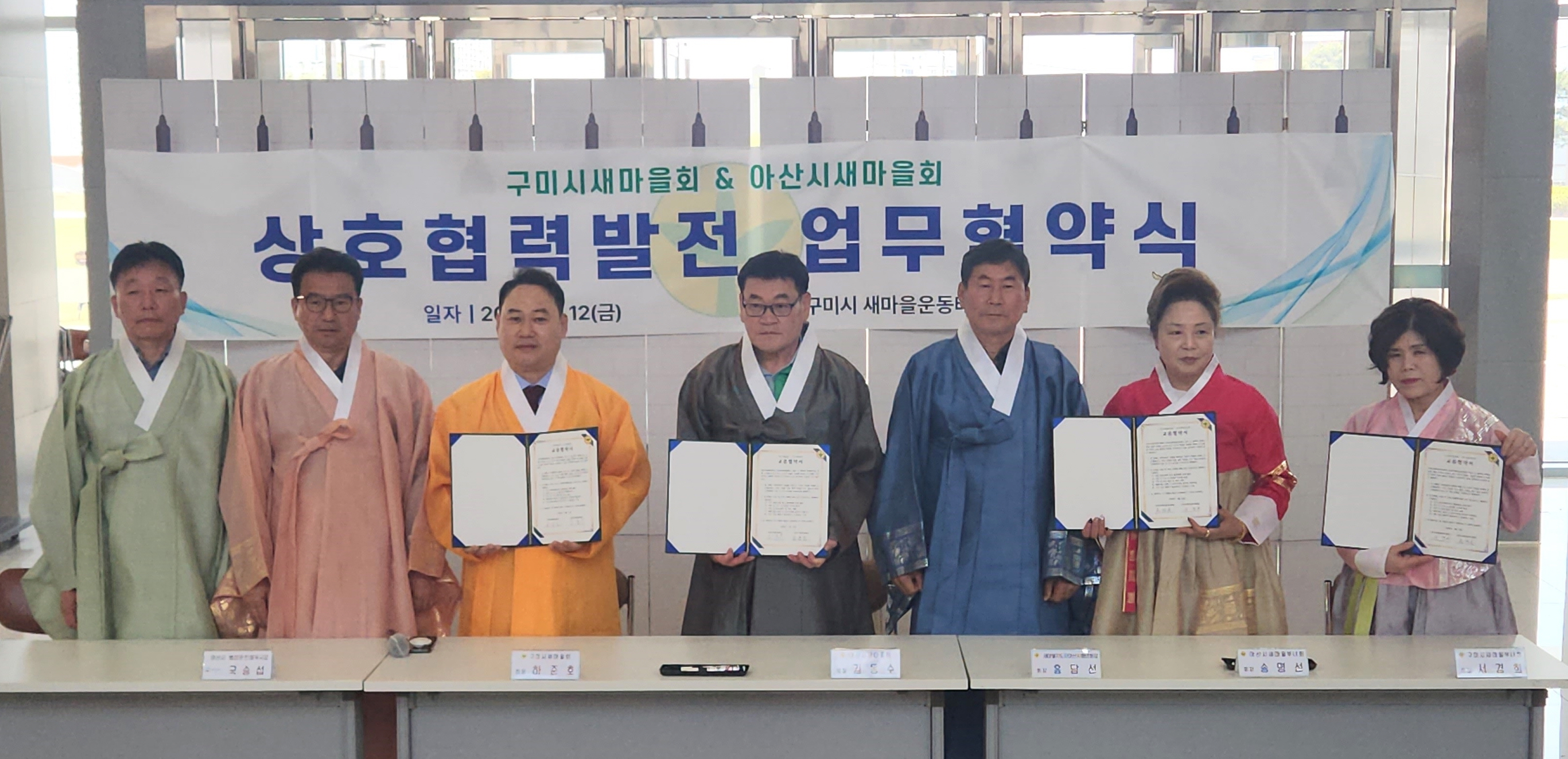 구미시는 지난 12일 새마을운동 테마공원에서 구미시 새마을회와 아산시 새마을회 회원 50여 명이 참석한 가운데 자매결연 협약식을 개최했다.