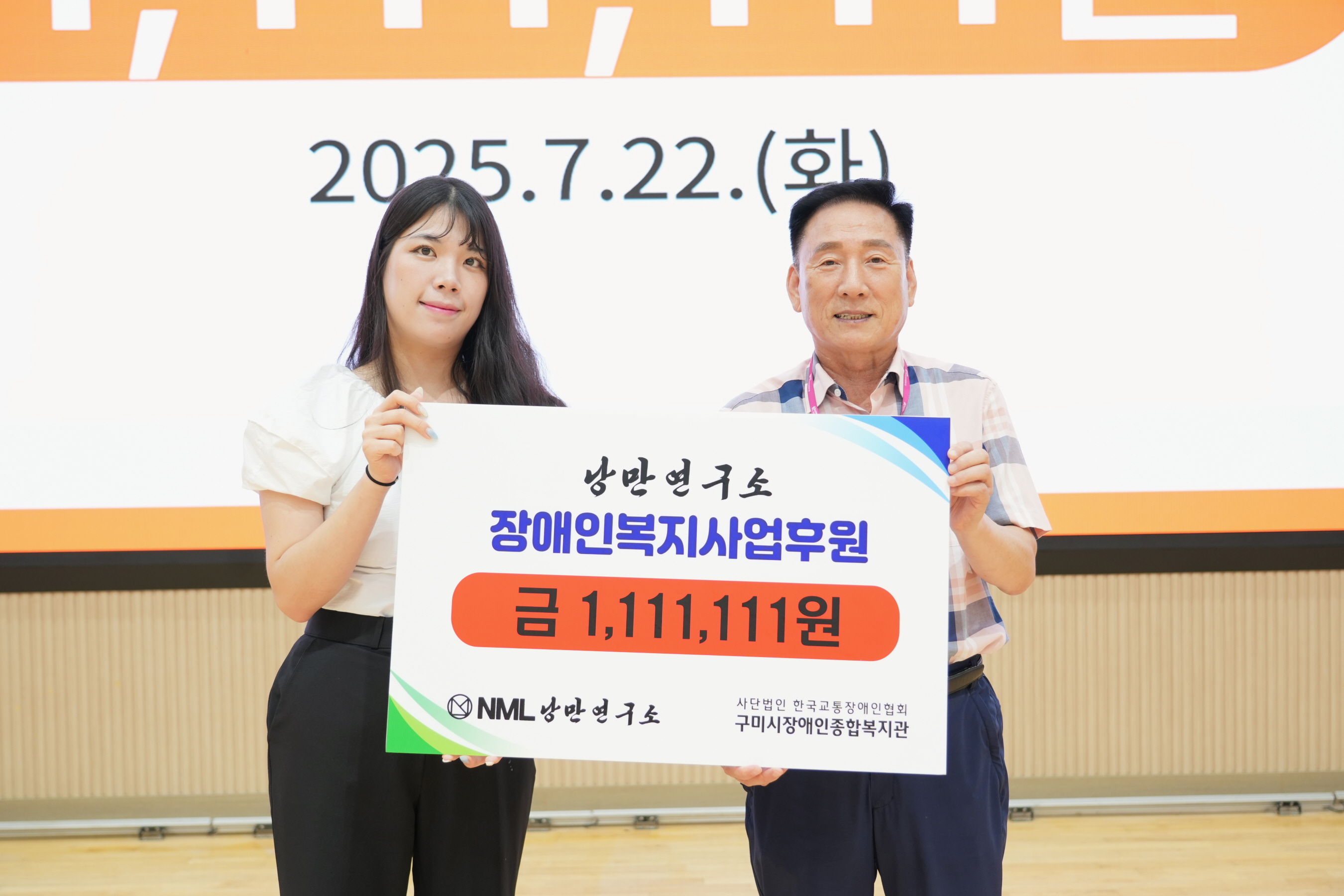 구미시장애인종합복지관(관장 김휴진)은 지난 22일 구미시 원평동에 위치한 사회적기업 낭만연구소(소장 박창욱)로부터 1,111,111원의 후원금을 전달받았다. 이번 후원은 낭만연구소가 지역사회와의 상생을 위한 나눔을 실천한 첫 사례로, 복지관의 주요 장애인 지원사업에 실질적인 도움을 줄 예정이다.