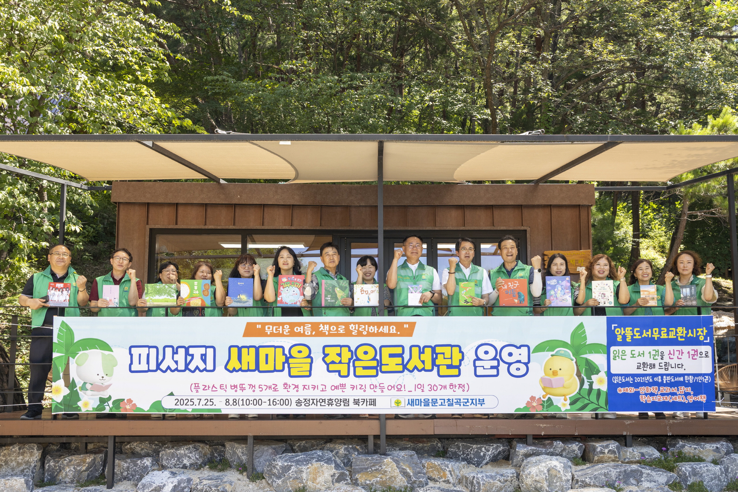 | ↑↑ 송정자연휴양림 ‘피서지문고’ 앞에서 새마을문고 칠곡군지부 회원들과 김재욱 칠곡군수가 함께 기념촬영을 하고 있다. 책과 나눔, 자연이 어우러진 특별한 여름 풍경이다. |