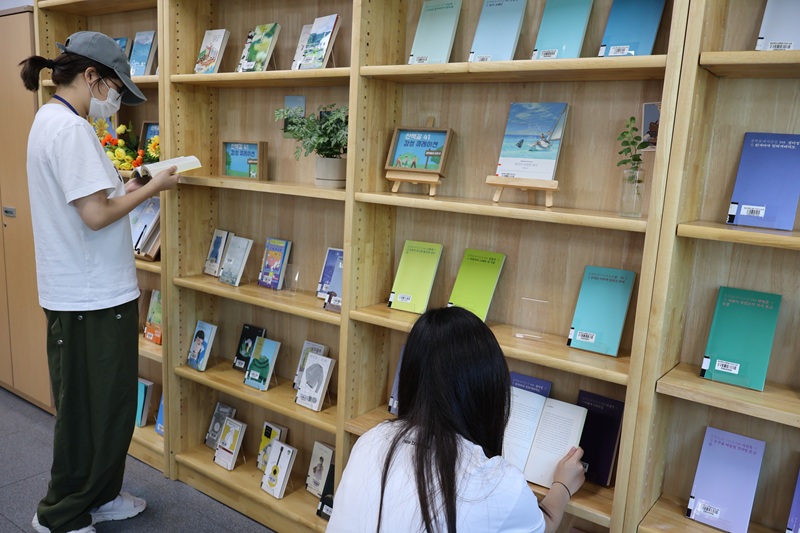 어린이자료실 앞에는 아기자기한 감성 무더위 쉼터가 마련되어 가족 단위 이용객들의 발길을 붙잡고 있으며 문화애뜰에서는 참여형 필사 공간인 ‘필사의 방’을 운영해 깊이 있는 사색의 시간을 선사한다.